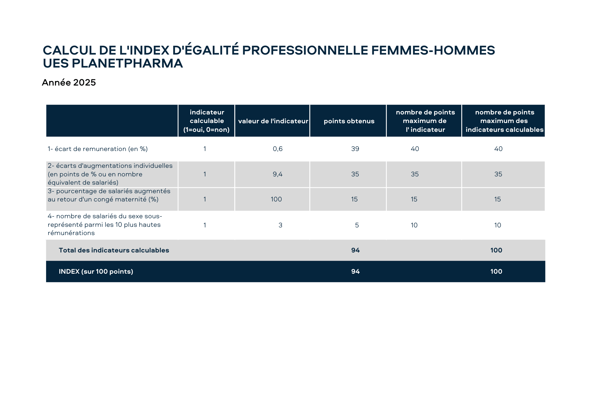 Publication de l'index de l'égalité professionnelle entre les hommes et les femmes de l’UES PlanetPharma 2021.